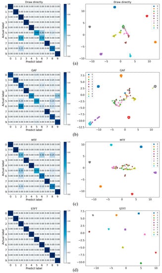 Confusion matrix and cluster analysis results of four methods: (a) draw directly, (b) GAF, (c) MTF, (d) STFT.