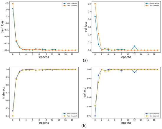 Training results of single-channel data and two-channel data in the CWRU dataset using the STFT method: (a) Train loss and val loss, (b) Train acc and val acc.