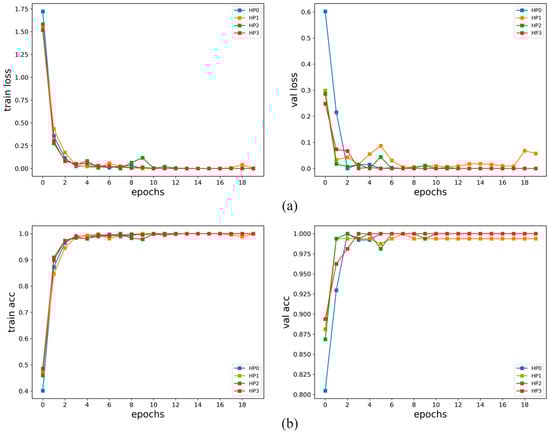 Training results of four load conditions: (a)Train loss and val loss, (b) Train acc and val acc.
