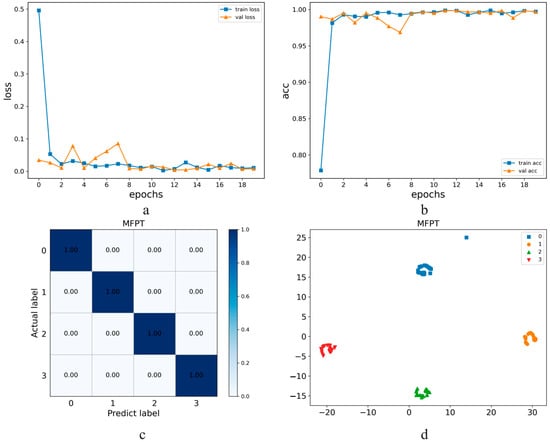 Diagnosis results of MFPT dataset with STFT method: (a) Train loss and val loss, (b) Train acc and val acc, (c) confusion matrix, (d) cluster analysis result.