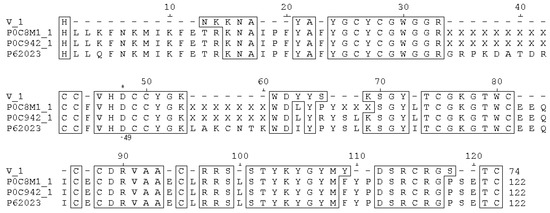 The sequence alignment of the deduced amino acid of the novel V-1 was compared with PLA2 present in other venoms such as the ones coming from Lachesis muta muta (Accession Number P0C8M_1 and P0C942_1) [52] and Crotalus scutulatus scutulatus (Mojave rattlesnake) (Accession Number P62023). As shown in Figure 3, non-determined amino acid residues were marked by (X), and boxed amino acid residues were identical. The highlighted amino acid residues belong to the PLA2 conserved domain Ca2+-binding loop, the β-wing region, and the catalytic site.