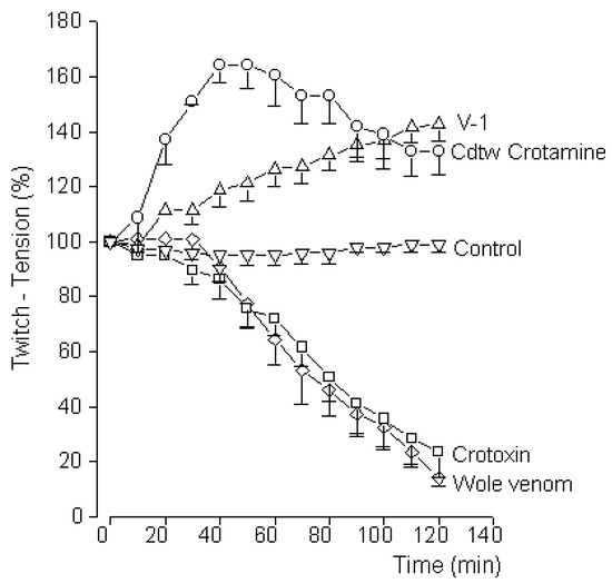 The effect of V-1 on isolated muscle cells was also investigated (Figure 4). Fraction V-1 exhibited a 2.5-fold increase in twitch tension record compared to control values, whereas the crotamine exhibited a 2.3-fold increase.