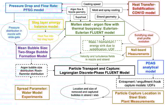 The multiphase flow of molten steel with argon gas, superheat transport, and temperature distribution in the molten steel, particle transport, and particle capture via three different mechanisms was simulated using a system of computational models. Figure 1 shows a flow chart of the computational model system.