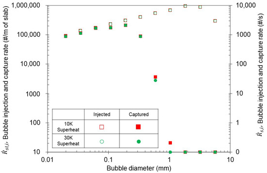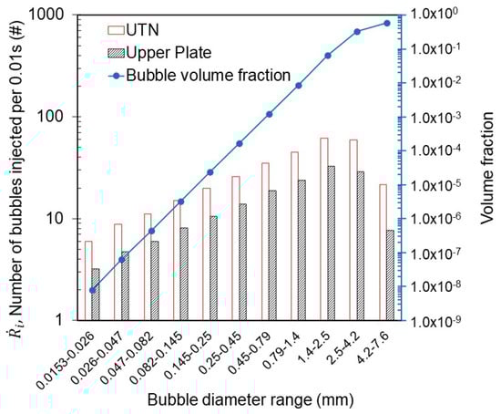 where the spread parameter, n, is taken as 3.5 based on the curve fitting of the bubble size measurements in a water model [57]. The bubble injection rate (#/s) through the UTN and slide-gate upper plate in the full-domain nozzle cross-section, , and the corresponding volume fraction of each bubble-size range are shown in Figure 2.