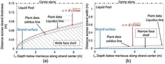 The shell thickness profiles in the strands on both the wide and narrow faces were calculated from the CON1D model [58]. This model includes a one-dimensional transient finite-difference calculation of heat transfer and solidification within the steel shell coupled with a steady-state model of heat conduction within the mold wall, which captures the effects of the water slots across the width direction using a reduced order model (ROM) [59]. CON1D extends the ROM to a two-dimensional mold model near the meniscus, to account for the vertical heat flux there. CON1D can predict the shell thickness, temperature distributions in the mold and shell, heat transfer across the interfacial gap, and other related phenomena [58]. Then the strand shell thickness can be roughly characterized by a solidification constant, K, of 3.2 mm/ ( in/), based on fitting the CON1D output to: