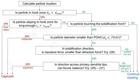 Particles can be captured as they rise beneath the solidified meniscus hooks, which are modeled by the hook capture mechanism [17]. The hook zone is defined as a region below the hook and above the solidifying shell, as shown in Figure 5a. There are three possible fates of a particle entering the hook zone: (1) touch the moving-down hook and become captured, (2) touch the solidification front and evaluate the criteria for the entrapment/engulfment mechanisms, and (3) flow out of the hook zone and back into the bulk flow.