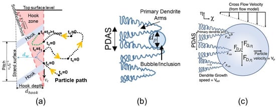 Many researchers have investigated the transport and capture of argon bubbles and non-metallic inclusions by assuming instant capture when a bubble or inclusion touches the solidification front referred to as the “simple criterion” [5,6,7,8,9,10,11,12]. Although this method is valid for particles smaller than the primary dendrite arm spacing (PDAS), it overpredicts the capture of particles too large to fit between the primary dendrite arms, which are often washed away back into the flow.