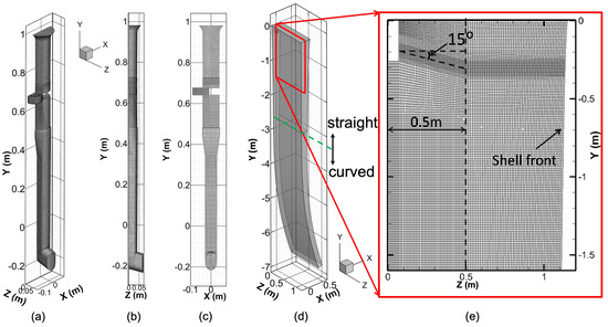 A three-dimensional steady-state E–E RANS model was employed to simulate the multiphase flow of molten steel and argon gas in both the nozzle and the liquid pool of the caster, using the commercial finite-volume software ANSYS FLUENT [60]. UDFs are used to account for mass, momentum, and energy sinks around the liquid pool boundary due to the steel solidification [6,61]. The governing equations of the E–E model solve separate continuity and Navier–Stokes equations for each phase. The continuity equation of each phase is as follows: