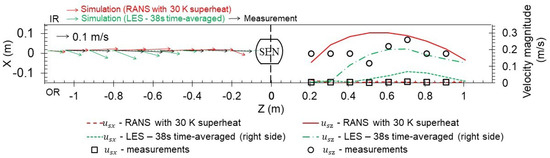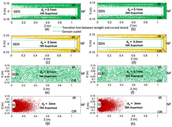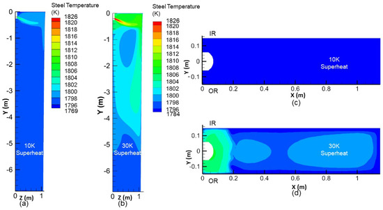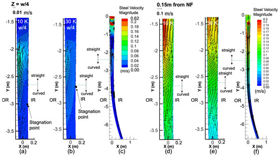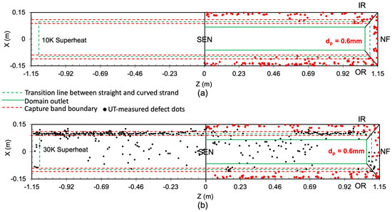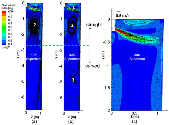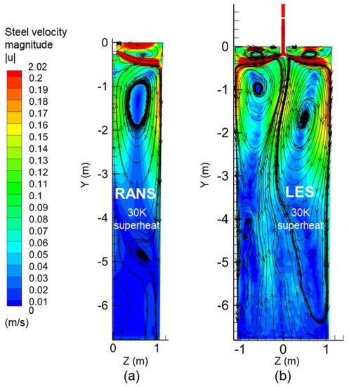 As another important phenomenon, superheat can potentially affect the particle capture by changing the molten-steel flow pattern in the strand region due to thermal and solutal buoyancy. Only a few previous studies have investigated superheat transport in computational flow models of continuous casting of steel [13,14,32,33]. These models show that most of the superheat is removed in the mold region, or just below [32,33]. The temperature of the molten steel in the mold decreases continuously with distance along the path traveled by the flowing jet, with the lowest temperatures found at the meniscus region, near the narrow faces (NFs), and near the submerged entry nozzle (SEN), for a typical double-roll flow pattern [32,33]. Huang et al. [33] show that the superheat has a negligible effect on the mold flow. Shi et al. [34] measured the temperature in a mold and showed that the Reynolds-averaged Navier–Stokes (RANS) model can match the measurements. However, no previous model has modeled fluid flow deep into the caster, where velocity is slower, and the importance of superheat is unknown. Superheat is known to affect the internal quality, owing to its strong effect on the microstructure. Lower superheat produces less centerline segregation and related quality problems [35,36,37]. However, its effect on particle capture has received little investigation.