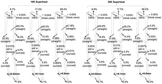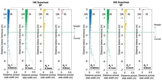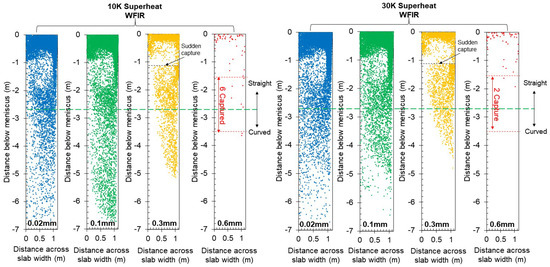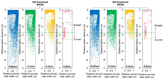 The hook depth is defined as the horizontal distance between the hook tip and the slab surface. Lee et al. conducted experiments on ultra-low carbon steel samples to quantify the relation between the casting parameters and the hook depth, and an equation was proposed to predict the hook depth as a function of mold oscillation frequency , mean level fluctuation , and solidification temperature of slag powder [31]. In this study, this equation was applied for low-carbon steel with = 68 cycles/min, = 1.8 mm, and = 1150 °C. The results are hook depths of 5.6 mm with low (10 K) superheat and 4.5 mm with high (30 K) superheat. The real hook depth was rarely this deep, possibly because the empirical equation was developed from experiments on ultra-low carbon steel, which is more susceptible to hook formation. However, the calculated deep hooks can be used to investigate worst-case scenarios regarding hook capture and compare with the entrapment/engulfment mechanisms to study the importance of the hook capture mechanism.