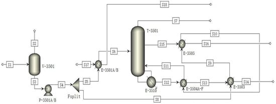 Aspen Plus is mainly used to calculate the strict mass and energy balance of the process, predict the flow rate, composition, and properties of the logistics, predict the operating conditions, equipment size and optimize the process, etc. [29,30,31]. The use of Aspen Plus for the process simulation of sour water stripping has been reported in many articles, including those by Alvaro de Farias Soares [32], H. Gai [13], Ho Chii-Dong [33], Jinfeng Jia [34]. It can be observed that Aspen Plus is a great choice to simulate and establish the mathematical model in this study. In the simulation process, each unit module is established through the Aspen Plus model library, the Flash2 module of the flash is used to express the sour water buffer tank and acid gas separator [35], and the RADFRAC module is used to simulate T-3501. E-3510, E-3504A-F, E-3503, and E-3505 are simulated by the heater module. P-3501A/B is simulated by the pump module. In addition, it is important to abide by the conservation of mass and energy in the process of simulation. The main flowchart of the Aspen Plus simulation model is presented in Figure 1.