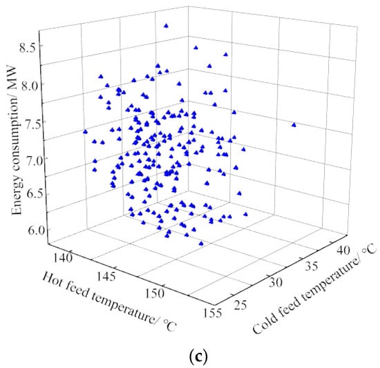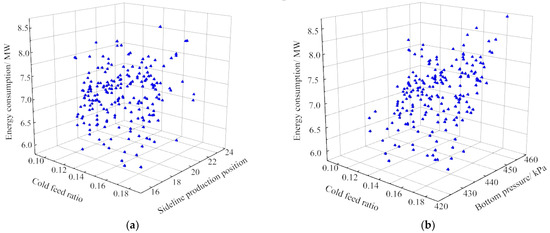 Two hundred sets of data collected by Aspen Plus are used for artificial neural network modeling. When constructing the ANN, the operation parameters of the stripper (cold feed ratio; sideline production position; tower bottom pressure; the temperature of hot feed; cold feed temperature) are selected as the inputs, and the energy consumption of the system is taken as the output. Under different working conditions, there are 200 groups of effective samples that are collected. Among them, the 1st to 120 groups of data are used as training samples for ANN training, while the 121st to 200 groups of data are used as testing and training samples and did not participate in training. After repeated training, when the ANN meets the convergence condition, the 121–160 sets of data can be used to verify the accuracy and reliability of the ANN model. If the convergence error limits meet the requirements after repeated training, the 161–200 groups of data can be input into the ANN for testing. The establishment of the sample database is shown in Figure 4. The blue triangles in Figure 4. represent sample points of corresponding system energy consumption under different operating conditions.