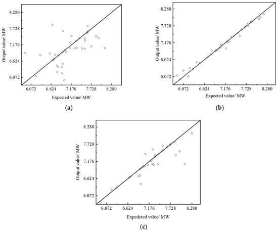 Comparison between the expected value and the true value of RBFNN. (a) Training stage; (b) validation stage; (c) testing stage.