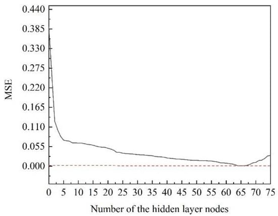 In Figure 6, it is clear that MSE decreases with the increasing number of hidden nodes. When the number of nodes is too small, the network cannot learn well, and the training times need to be increased. However, if the number of nodes is too large, the training time will increase, and overfitting is easy to occur. Therefore, as the number of nodes is 66, the error is 0.000998, and the MSE is less than 0.001, indicating the high accuracy of the neural network. So, a neural network with a structure of 5-66-1 is used to train RBFNN in this paper.