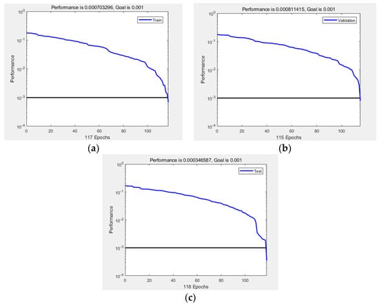 The performance of RBFNN. (a) Training stage; (b) validation stage; (c) testing stage.