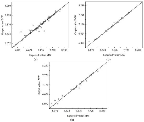 Figure 8 shows the comparison between the output value and expected output of RBFNN and the squares in Figure 8 represent the output values obtained by MATLAB. It can be observed from Figure 8 that the expected value and the output value of RBFNN are approximately linear, and the R2 of the training stage, verification stage, and test stage is 0.975, 0.962, and 0.933, respectively, indicating that the expected value and the output value are highly correlated. The RBFNN has high accuracy and reliability for predicting the energy consumption of the sour water stripping process.
