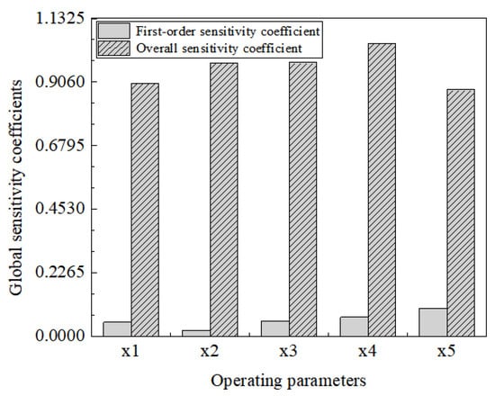 RBFNN is used to train, verify and test 200 groups of data, and the input and output matrices are obtained. The Sobol index method is used to analyze the input and output matrices, and then the first-order sensitivity coefficients and overall sensitivity coefficients of each operating parameter are obtained. In addition, the Sobol method is a convenient way to investigate the influence of parameter cross action. The first-order sensitivity coefficient reflects the effect of single parameter changes on the system energy consumption level, and the overall sensitivity coefficient not only reflects the influence of single parameter changes, but reflects the influence of interaction with other parameters changes. When the difference between the first-order sensitivity of a parameter and the overall sensitivity is large, the sensitivity suggests that there is an obvious interaction. In this study, x1, x2, x3, x4, and x5 represent the cold feed ratio, sideline production position, tower bottom pressure, hot feeding temperature, and cold feed temperature, respectively. Table 4 shows the first-order sensitivity and the overall sensitivity coefficient. Figure 8 is a histogram of the global sensitivity coefficient.