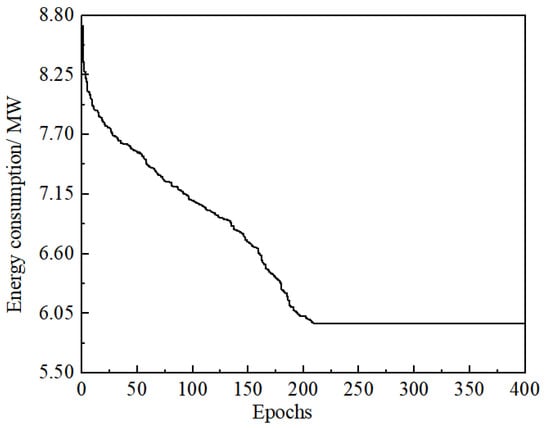 According to the above research content and aimed at the minimum energy consumption of the system, this paper uses MATLAB to generate a random input parameter matrix with a population of 200 particles and a dimension of each particle of 5 consistent with the Gaussian distribution to form the initial population through the randn () function. The PSO algorithm is used for global optimization, where particle fitness is calculated by the RBFNN prediction model. The termination conditions of the PSO algorithm include setting the maximum number of iterations, that is, when the number of iterations of particle evolution reaches 400, the iteration is stopped and optimization results are obtained, as shown in Figure 10.