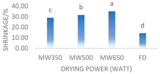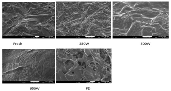 In the present study, the highest shrinkage values were observed in the tree tomato fruit dried with microwaves at 650 W followed by those dried with microwaves at 500 W with 35.19% and 31.67%, respectively. Freeze-dried fruit showed a low shrinkage level with 14.34% compared to other tested methods. The freeze-drying process left the pronounced holes as shown in Figure 2 from SEM as the water molecules first condensed in ice and then evaporated as solid. This study is supported by previous studies [19,61,64,65].
