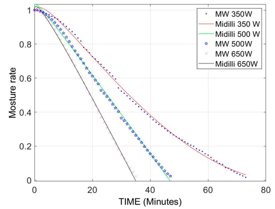 The obtained drying curves were processed to find the most suitable model among the various moisture ratio expressions are given in Table 1. The moisture ratio was expressed as per Formula (4) [30,31]: