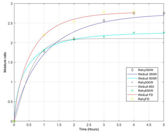 In the modeling of drying kinetics, it is assumed that the model which shows the lower SSE, RMSE, and X2 and highest R2 is the best-suited one for both dehydration and rehydration kinetics. This study suggested mostly the Midilli model for dehydration and Weibull for rehydration which gave the best simulation of the curves of dried tree tomatoes based on the percentage of demonstrated variances. The rehydration kinetics curve is best described by the Peleg Model and is summarized in Figure 4 and Table 5. This study revealed that the time required for rehydration depends on the power used for drying. The longest time was observed in tree tomato fruit dried in microwaves at 650 in 108 min followed by the tree tomatoes dried using microwaves at 500 W in 105 min. The present study is supported by recent studies [66,67,68,69,70].