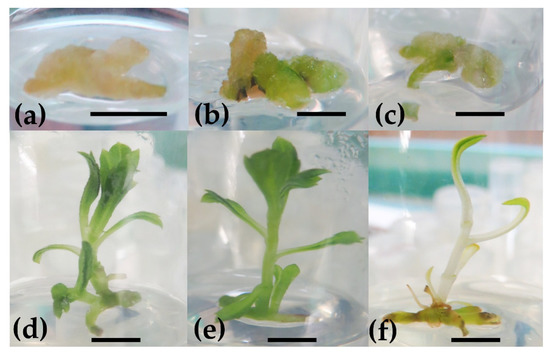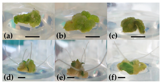 Morphogenetic responses of nodal explants after 15 days of their incubation: (a) BAP (0.1 mg/L) with PIC (1.0 mg/L), (b) KIN (0.1 mg/L) with 2,4-D (1.0 mg/L), (c) BAP (0.1 mg/L) with PIC (0.1 mg/L), (d) KIN (0.1 mg/L) with PIC (1.0 mg/L), (e) BAP (0.1 mg/L) with 2,4-D (0.1 mg/L), (f) BAP (0.1 mg/L with IAA (1.0 mg/L). Scale bar = 10 mm.