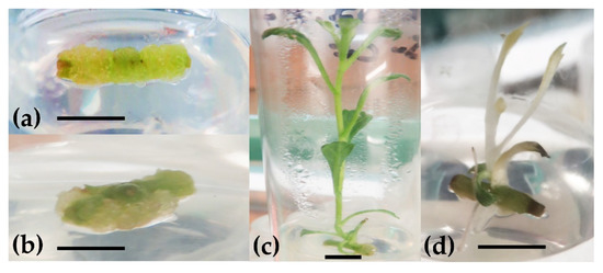 Morphogenetic responses of internode explants after 15 days of their incubation: (a) BAP (0.1 mg/L) with NAA (1.0 mg/L), (b) KIN (0.1 mg/L) with 2,4-D (1.0 mg/L), (c) BAP (0.1 mg/L) with IAA (0.1 mg/L), (d) BAP (0.1 mg/L) with PIC (0.1 mg/L). Scale bar = 10 mm.