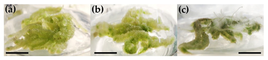 Morphogenetic responses of root explants after 10 days of their incubation: (a) KIN (0.1 mg/L) with 2,4-D (1.0 mg/L), (b) KIN (0.1 mg/L) with NAA (1.0 mg/L), (c) KIN (0.1 mg/L) with 2,4-D (0.1 mg/L). Scale bar = 10 mm.