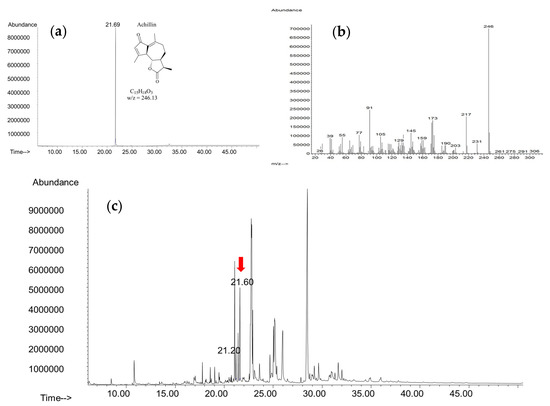 We previously isolated and purified the achillin compound from the dichloromethane: methanol (95:05) leaf extract from A. ludoviciana wild plant. The pure compound (Figure 6a–c) was used as a reference for quantification of achillin in dichloromethane extracts from the in vitro culture. Chromatograms, as well as data about the quantification method, are reported in the Supplementary Material (Figures S1–S3).