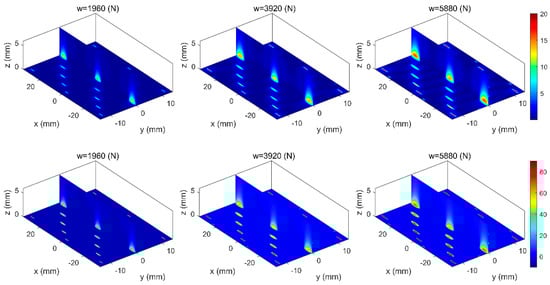 Figure 3 presents xy and xz slices of the von-Mises stresses and those of the z-component stress distributions under different load conditions. One can see that on the surface, the pattern of the von-Mises stress, SVM, was similar to that of the z-direction stress component, Sz. One should notice that Sz on the surface was actually the contact pressure. The larger the load, the larger the local contact areas, and with an increase in the load, SVM and Sz at a point increased.
