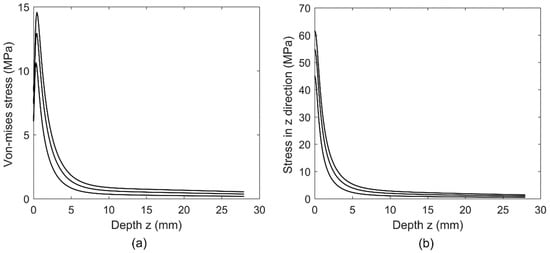 Variations of von-Mises stress, SVM, (a) and z-component stress, Sz, (b), with the depth z for w = 1960, 3920, 5880 (N) from bottom to top.