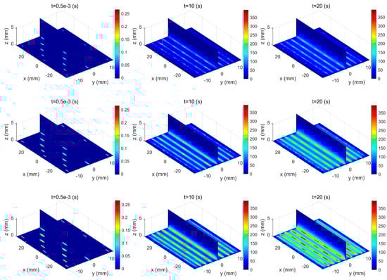 Figure 5 shows the transient temperature distributions on the xy and xz planes with different loads. At the initial time (t = 0), the wire rope was still and generated many elliptical contact spots on the friction lining’s groove and, then, with the wire rope sliding (t > 0), the moving contact spots formed the contact bands. One can see from Figure 5 that the larger the load w, the larger the width of the contact spots (bands) and the larger the temperature rise.