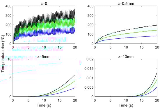 Further, in Figure 6 we present the temperature rise at some depths below the surface point (x = 0, y = 0). One could find that with time, the temperature near the surface showed a saw-tooth pattern. With time, the surface and sub-surface temperatures increased. With increasing depth z, the temperature decreased and temperature fluctuation reduced.