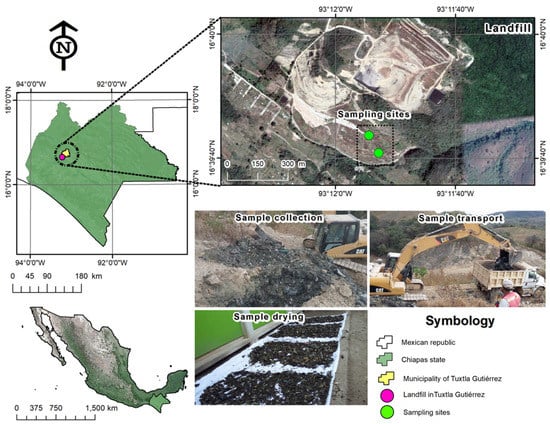 The AR used to pack the bioreactor was acquired from the closed area of the landfill in the city of Tuxtla Gutiérrez, Chiapas, Mexico (16°45′11″ north latitude and 93°06′56″ west longitude), specifically from the points indicated in Figure 1, where the samples were extracted at a depth of 1 to 2 m with the help of a backhoe. For its preparation and drying, the methodology and recommendations established by Bautista-Ramírez et al. [] were followed. The AR was separated into two different particle sizes: >40 mm and ≤40 mm.