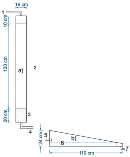 The ARFB was built using a PVC tube of cylindrical geometry (Ø = 0.16 m and h = 1.6 m) as shown in Figure 2a. A 0.20-meter section filled with 1″ gravel was installed at the bottom of the bioreactor as support material; then, 1.30 m of AR with particle size ≤ 40 mm was placed, followed by 0.10 m of freeboard, giving a total height of 1.6 m. To contain the bioreactor material, the bottom was closed with a perforated PVC lid. In addition, to avoid the dragging of fine materials, the support material of the bioreactor was placed inside a shade-net bag.