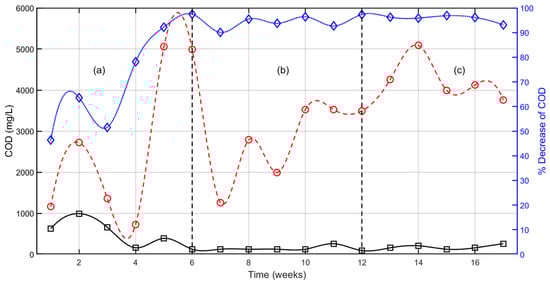 Figure 3 shows an initial fluctuation in the decrease in COD (46.4–78.1%) for the first 4 weeks of monitoring, a behavior that can be considered as expected given that the ARFB stabilizes 3 to 5 weeks after the process starts []. Bearing in mind that ARFBs operate under semi-aerobic conditions, this relatively short stabilization period may represent an advantage of the system, especially when compared to anaerobic-type biological processes which may require stabilization periods of 2 to 9 months [,] or even longer when an initial inoculum is not considered. According to [], AR has an improved biodegradation capacity, without the need for microbiological consortiums to require an acclimatization period; it is a spectrum of microbes with a high capacity for biodegradable and refractory organic matter degradation.