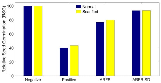 When performing Fisher’s test with a 0.05 confidence level, a significant difference was observed only between the positive control and the ARFB-SD group. This is attributed to small variations in the germination index of the seeds on different days: for the ARFB-SD group, there was an oscillating response on different days, both in normal and scarified seeds, while the positive control had a clear downward trend.
