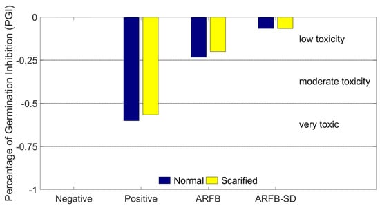 The PGI establishes toxicity values from −1 to >0 under the following criteria: 0 to −0.25, low toxicity; −0.25 to −0.5, moderate toxicity; −0.5 to −0.75, high toxicity; −0.75 to −1, very high toxicity; values >0 indicate radicle growth or hormesis [].