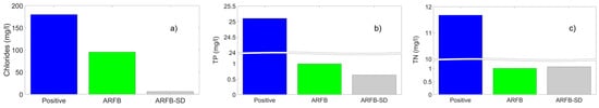 The concentrations of chlorides, TP and TN for the different types of water are presented in Figure 6, where a significant decrease can be observed in the chlorides graph (Figure 6a) in its concentration as the level of treatment increases; that is, the decrease between the positive control and the two treatment groups (ARFB and ARFB-SD) was 52.86% and 96.57%, respectively. Thus, the difference in the germination index of the treatment groups can be associated to the chemical load (inorganic ions) existing in the water used. According to [], seeds that are exposed to high concentrations of chlorides can delay radicle and plumule growth, causing the development of the seedling to be affected, as observed in the RSG.