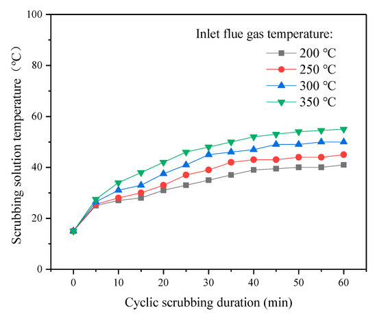 In Figure 3, the efforts of seawater scrubbing temperature were tested. In the experiment, 30 L artificial seawater was a cyclic scrubbing solution. The initial temperature of the scrubbing solution was 23 °C. The spraying nozzle flow rate was about 1 L·min−1. As shown in Figure 3, the scrubbing solution temperature (Figure 1, T2) will gradually rise, and the temperature of the scrubbing solution will rise gradually at the beginning and eventually stabilize. In the experiment, inlet gas temperatures (Figure 1, T3) were set at 200 °C, 250 °C, 300 °C, 350 °C, the duration of seawater washing was 60 min, the scrubbing solution temperature (Figure 1, T2) was 41 °C, 45 °C, 49 °C, 54 °C, respectively. The temperatures of outlet gas (Figure 1, T1) were 50 °C, 54 °C, 60 °C, and 65 °C, respectively. It can be seen, through seawater scrubbing, that the reaction temperature of the flue gas can be controlled at a lower value. The seawater scrubbing absorption method can reduce the oxidation reaction temperature of flue gas, inhibit the decomposition of ozone at high temperatures [37], and promote the denitrification effect.