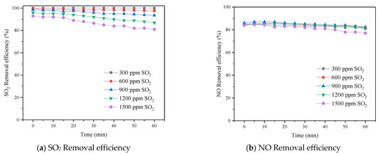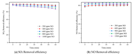 According to Figure 5b, the NOx removal efficiencies increased slightly when SO2 concentration increased from 300 ppm to 900 ppm. This may be due to the SO2 concentration being low, which the chemical reactions (5), (6), and (7) will undergo to produce more and ions, which can react with NO2 (formula (11), formula (12)) to remove NOX. However, when this exceeds 1200 ppm, the removal of SO2 used up a large amount of scrubbing solution, and denitrification efficiency will be reduced.