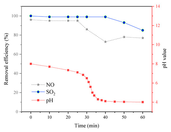 In the spraying tower, No is oxidized to a high valence mixture (NO2, and N2O5) by O3, and then, NO2, N2O5, and SO2 are absorbed by the seawater solution (The flow rate of the spraying nozzle was about 1 L·min−1) 30 L. The initial pH value of artificial seawater was 8. The cyclic seawater solution temperature is kept at 50 °C by a water bath. The inlet concentrations of NO and SO2 are 300 and 1000 ppm, respectively; are 1.2. The absorption time is 60 min. pH values, desulfurization, and denitrification efficiency were recorded at intervals of 1 min to 5 min. The experimental results are shown in Figure 6.