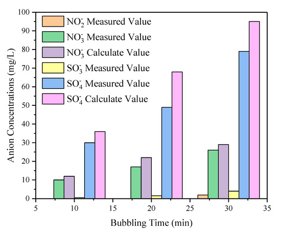 Analysis of desulfurization and denitrification products were shown in Figure 7. Sampling every 5 min, desulfurization products were mainly and . During the reaction, O3 could also oxidize to . Therefore, was the final main existence forms of sulfur in the solution. Denitrification products were and a small amount of . Although is highly toxic, the content is small. Furthermore, it can be seen that the trend of the experimental values was close to the theoretical values. The errors mainly come from sampling and statistical errors.