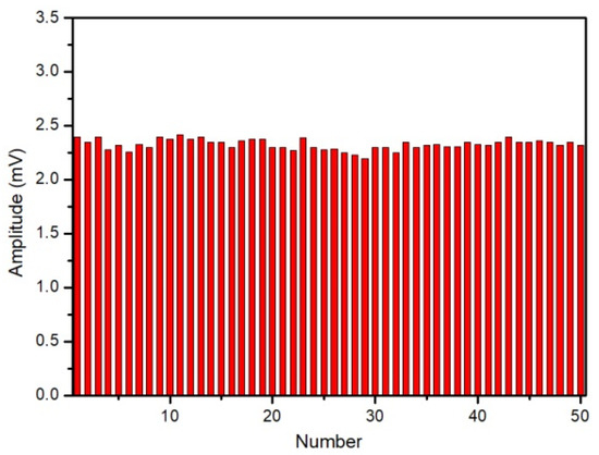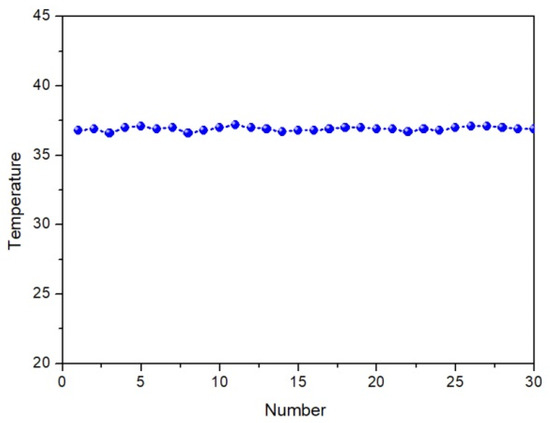The stability of the instrument was tested and verified after the optical path calibration and debugging was completed and the second harmonic signal was obtained. In order to ensure the accuracy of detection and promote the growth and reproduction of bacteria in the culture bottle, it was necessary to maintain a constant growth temperature of 37 °C and constant mixing during the culture process, so that bacteria could fully contact the culture medium. Therefore, the stability of the temperature control (Figure 4) and agitation mixing (Figure 5) of the equipment was tested. The test results of temperature control stability are shown in Figure 4. As we can see, the temperature control unit of the equipment can keep the temperature of each culture bottle constant at about 37 °C on the basis of uniform heating, and the fluctuation range of the temperature is less than 0.5 °C, which has good temperature control stability. Figure 5 shows the signal stability test results of the equipment under the conditions of stirring and mixing. The amplitude of the second harmonic wave floats at 2.3 mV, within the allowable range of error. This indicates that the mixing of bacteria and culture medium in the process of culture by magnetic stirring not only has a good mixing effect, but also does not cause the fluctuation of the test signal.