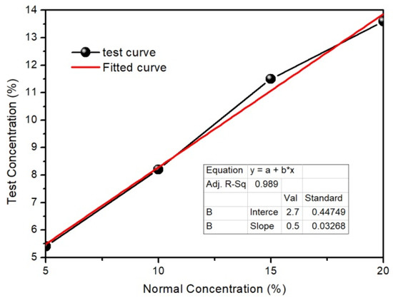 On the basis of good stability test of the instrument, standard CO2 gas with concentrations of 5%, 10%, 15% and 20% was used to calibrate the instrument (Figure 6). It is shown that CO2 gas with a concentration gradient of 5% can be clearly distinguished according to the second harmonic amplitude, and the fitting results also show that there is a good linear relationship between the second harmonic amplitude and CO2 gas concentration (average value of 5000 tests).