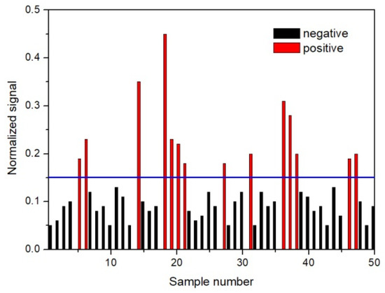 Figure 7 shows the culture results of samples from suspected infected patients in aerobic culture bottles. The results are marked with different colors. The height of the line of the positive result represents the signal amplitude of the DLWMS optical detection system when the commercial equipment recognizes the positive result or negative result. The results show that the negative results measured by the new optical detection system based on DLWMS are all below the threshold value, and the positive results are all above the threshold value, without false negatives or false positives, which is highly consistent with the results measured by the commercial equipment.