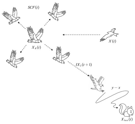 In the third improved method, the Aquila searches thoroughly around the prey and then attacks it. Figure 2 shows this strategy, called Aquila search around prey and attack. This method aims to improve the exploitation capability, and is mathematically expressed by Equation (11):