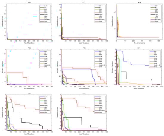 As multimodal functions have several local optima, they were employed to evaluate the IAO’s exploitation capability. The multimodal experiments were divided into two categories, multidimensional (F8–F13) and fixed-dimensional (F14–F23), to test the exploration ability of the IAO in multiple dimensions and low dimensions, respectively. From Table 5, it can be seen that the IAO attains the smallest Average and STD values, excluding F12. For F12, SNS performs best, while IAO achieves the second best position. As for the fixed-dimensional experiments, which are shown in Table 8, IAO achieves the best performance in more than half of the sets. These comparative trials show that IAO’s exploration capability is superior to its competitors.