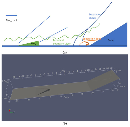 The illustration of the flow field (a) and the domain with MVG installed on the wall boundary (b).