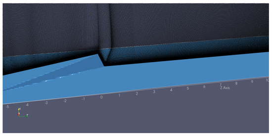In this study, supersonic ramp flow with an MVG installed on the wall boundary of the upstream domain was investigated. Figure 1a is a schematic diagram of the flow field. This study reconstructed a fully developed turbulent inflow at supersonic speeds as the inflow. This study had a boundary layer thickness set to twice the height of the MVG, generated in front of the MVG. In supersonic ramp flows, ramp shocks (or separation shocks in the figure) induce large separation regions. Figure 1b shows the dimensions of the ramp and the location of the MVG in the domain. The grid size of the entire system was . The horizontal distance from MVG tip to the ramp corner was . The distance from the end of the ramp to the MVG tip was about . The distance between the inlet and the MVG tip was . Figure 2 shows the grids around the MVG on a streamwise central plane, the grids were refined at the wall boundary. More detailed dimensions of the MVG and computational domain can be found in [20].